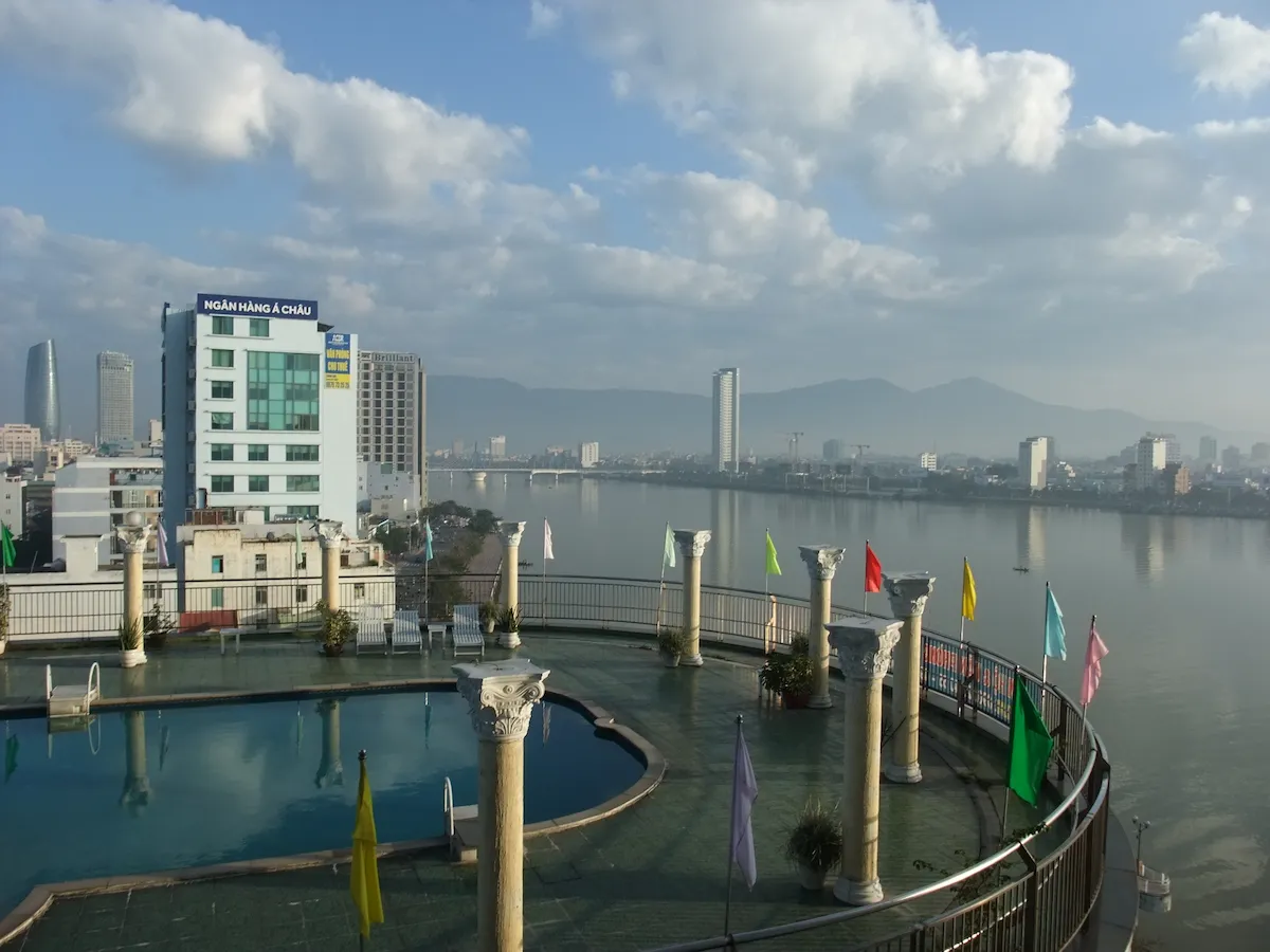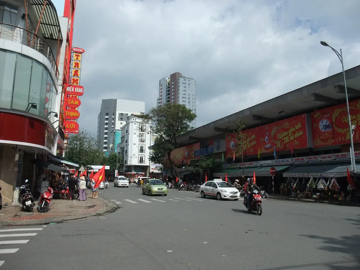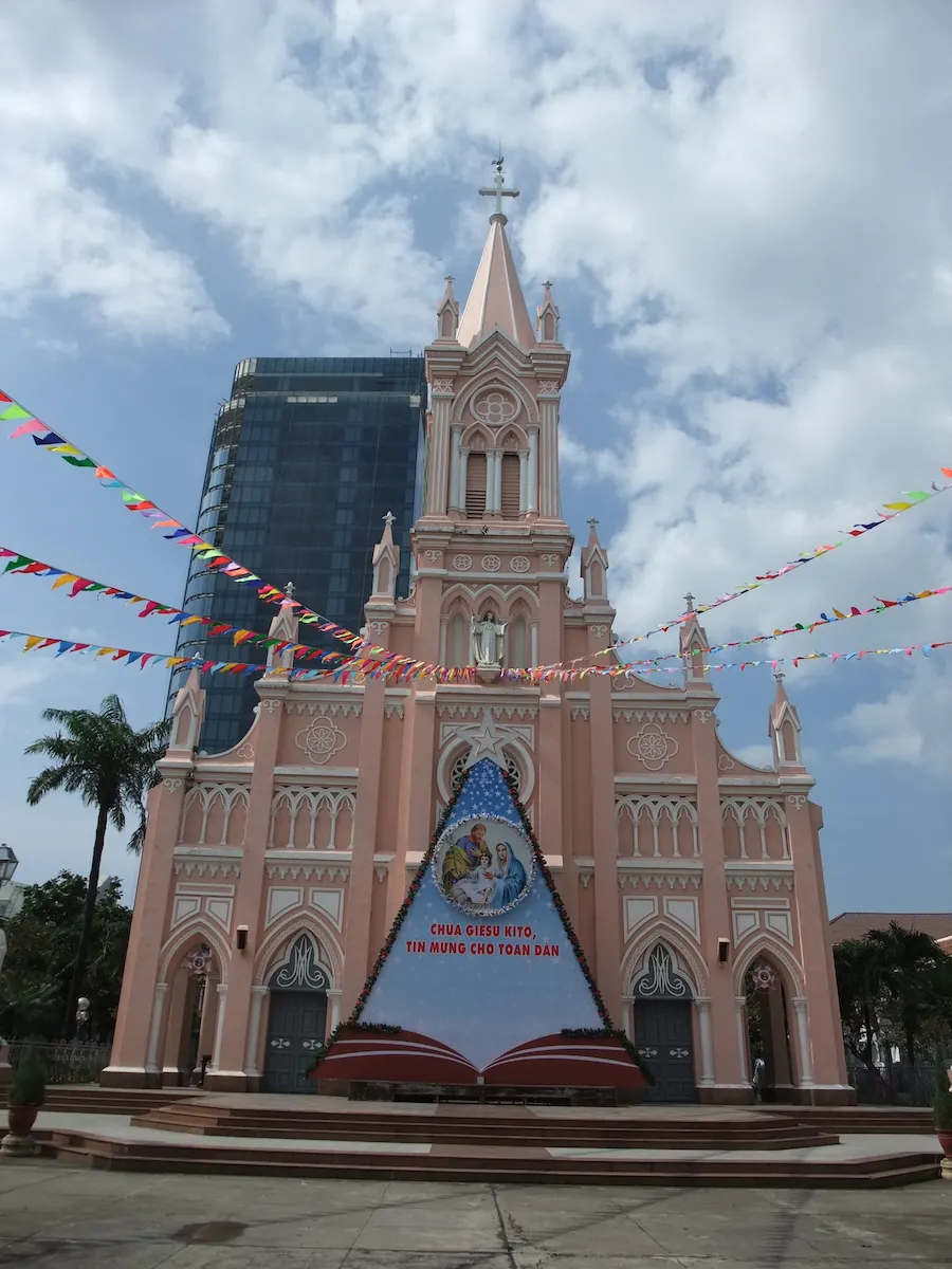 ベトナム中部の最大商業都市、ダナン 空港からまっすぐ伸びる道を走ると、龍の形をしたロン橋に至る ロン橋を含むハン川沿いが中心部で、ホテルや飲食店が並ぶ そんな中心部の高層ビルの中にピンク色のダナン大聖堂がポツンとある ハン市場というベトナム庶民の市場もあり、食料品売り場は凄い臭いである これといった観光地は無いが、周辺の街を旅する拠点とするのには良い街である