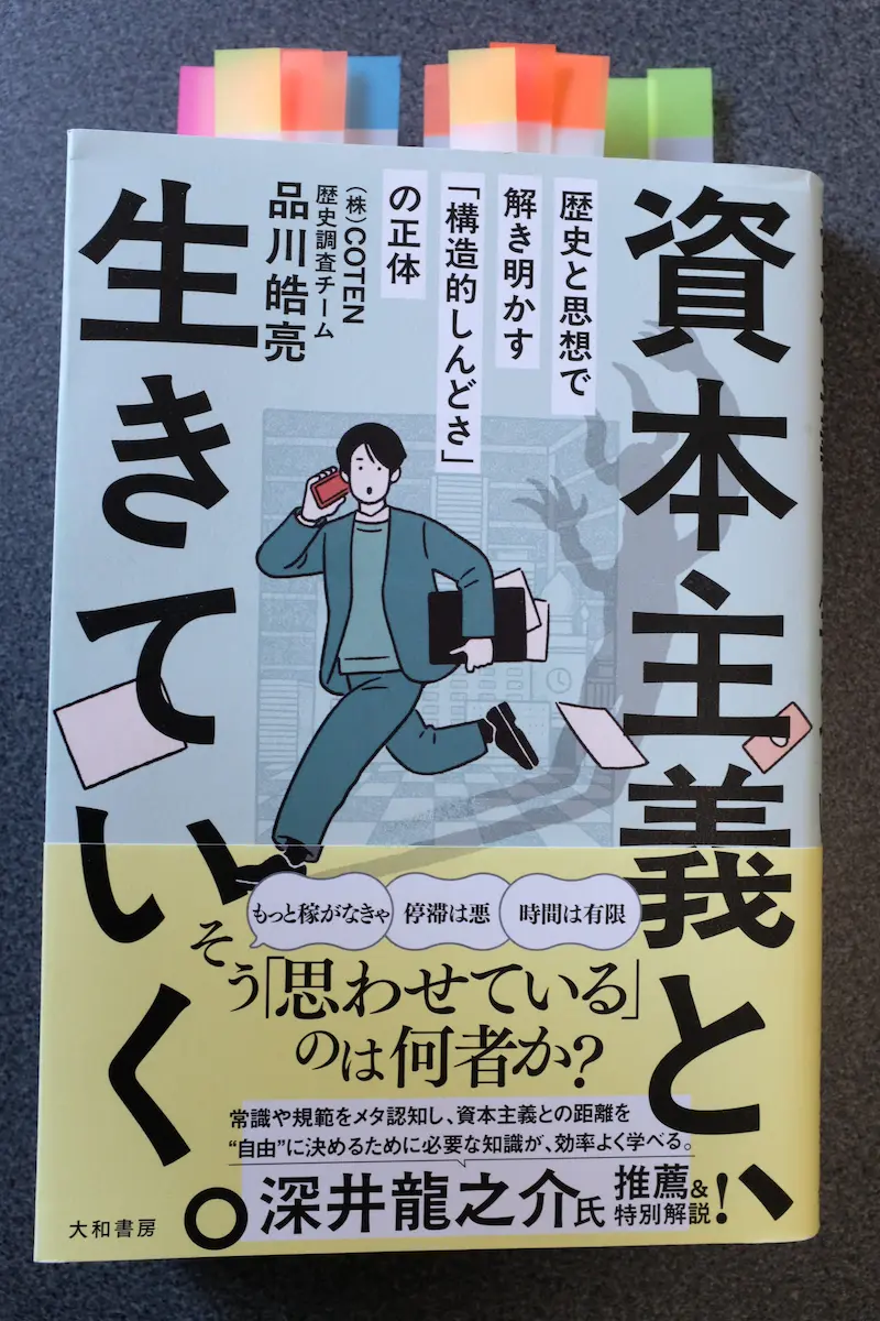 大人が子供を急かしても、子供は素知らぬ顔をして自分がやりたいことを続けます。 子を持つ親なら誰しもが体験することですが、大人の価値観の押し付けを子供にしているだけかもとふと思いました。 決められた時間に決められたことをきちんとすることが良いというのが一般的な大人の価値観です。 その価値観は人類共通のものだと思い込んでますが、もしかすると資本主義社会にどっぷり浸かっている影響かもしれないです。 その気付きに出会えたのは、こんな本を読んだからです。 「資本主義と、生きていく。」 品川皓亮著 この本は資本主義とどのように付き合っていけばよいか書かれた本です。 常に追われている感覚をもたらす6人の追手(時間、成長、数字、労働、お金、消費)が存在し、それらは資本主義を構成する6つの構成要素(分業、イノーベーション、金融、資本、商品、市場)と密接に関係していると述べています。 資本主義では、資本(資金、土地、工場など)を持つ資本家が、資本を持たない労働者を雇い、価値のある商品を生産し、余剰価値を利潤を得ます。 生産(≒利潤)を最大化するために資本家は「従順の身体」と表現される忠実に指示に従う労働者を求めます。 「従順な身体」の構築は、身体と精神の二つ面からの働きかけが有効です。 身体の面では工場労働にふさわしい時間感覚を刻み込み、精神の面では疑うことなく機械のように時間を守る心構えを作り出すことが目指されました。。 資本主義の発展には分業が不可欠だったのですが、その分業に不可欠だったのが、資本主義にふさわしい時間感覚をもつ労働者を作ることだったのです。 (自由)市場で生き残るには、きちんとした人間でなければなりません。 分業によって互いに依存し合う社会では、自分勝手な振る舞いは通用しないのです。 小さい頃から親や先生に決められた時間やルールを守るように言われていたのは従順な身体になるためだったのかもしれません。 そして社会でよしとされるルールが、いつの間にか個人の価値観として刷り込まれる「規範の内面化」が起こるのです。 最初の話で、子供に押し付けていた大人の価値観というのがこれなんじゃないかと思ったのです。 今の時代、この世に生を享けて教育を施されることは資本主義社会への順化をしているだけなのかもしれません。 この本は資本主義というものについて他にも色々考えさせてくれます。 先ほど資本家は労働者を「雇う」という表現をしましたが、資本家は労働力を「買う」とも言い換えられます。 買うのに必要なものは労働者が健康に毎日生産活動を行うことが出来るだけ費用(≒賃金)。 労働力を買うのに必要なお金以上に、生産してそれを売ることで得られるお金が多ければ、資本家のところへ大きなお金になって戻ってきます。 資本主義は「売るために買う」という、それまでの常識とは正反対の活動によって成り立つということです。 資本主義社会においては「お金で商品を買い、それを売ってより多いお金を得る」という循環自体が目的化されるということです。。 資本家は労働力という商品を購買し消費することによって、価値を増殖させている。。 労働力という商品だけが、他のすべての商品とは違って、新しい価値を生み出す力を持っています。 では何でお金をそんなに欲しがるんでしょうか。 お金があったら何でも買えるからと言われればそれまでですが、現代社会において生きるために最低限必要なお金は労働者であっても大体持っているはずです。 つまり、本来必要ではないものに対してお金を消費しているのが現代人の習性とも言えるのです。 役に立たない財の非生産的な消費はその人の経済的強さの印であり、ひいては人間としての価値の証明であるといいます。 生存に不可欠な欲求や人間の解放に役立つ欲求が「真の欲求」であるのに対し、現代社会の大衆には社会的に植え付けられた「偽の欲求」が蔓延していると指摘したのです。 現代社会では、モノの価値はその物自体が何の役に立つかではなく、他人との違いを生み出す役割を果たすことにこそあるのです。 消費者のニーズを満たすのには限界がある。ニーズそのものを作り出せばいい。 市場は、単なる商品の売買の場から、欲望を生産する装置へと変貌していきました。 ブランドもののバッグを持つとかは昭和バブルっぽい話ですが、海外旅行や豪華ディナーの写真をSNSにアップするのも人間としての価値を表現しようとしているものに他なりません。 SNSの写真を見て、同じようなものを欲しくなったり、AIにリコメンドされたものをついついポチってしまうというのも、欲望を生産する装置へと変貌した市場に操られている状態です。 Eコマースも20年前はメジャーではなかったのに、今や無くてはならない存在になっているわけで、市場に破壊的イノベーションが起きたと言えます。 資本主義を突き動かすエネルギーの核心は、既存の社会構造をひっくり
