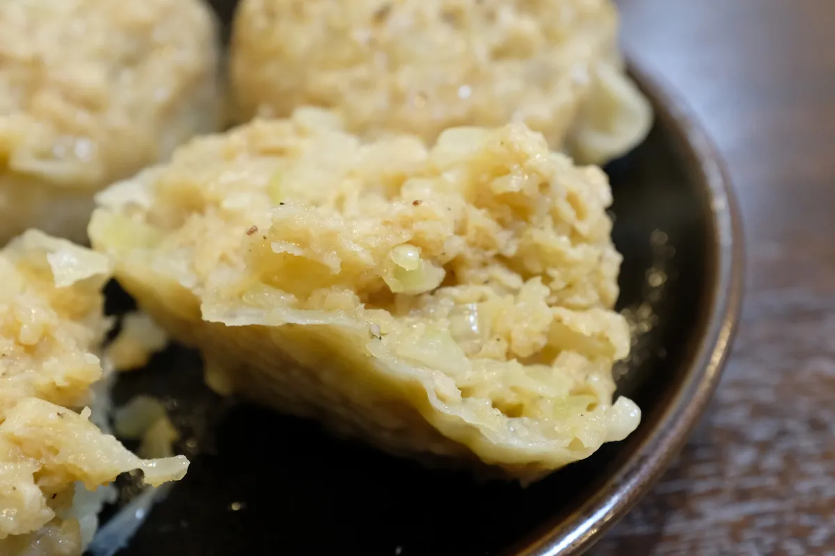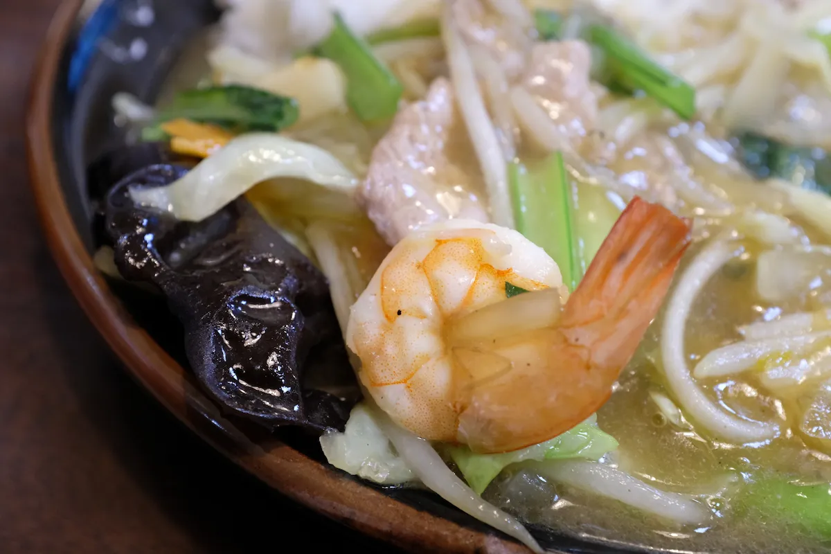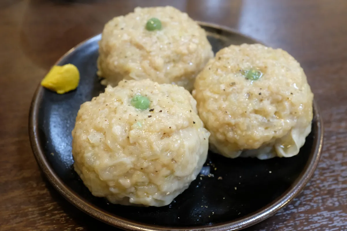 新発田駅から直ぐのところにある食堂「本田屋」で夕食を頂きました 17時半の開店直後に訪れたのに既に皆の中には多くのお客さんがいました 店の暖簾には「食堂」と書かれていますが、夜は食堂と飲み屋を足したような店のようです テーブル席に座り、今回はうま煮ライス1050円としゅうまい(3個)480円を注文しました 待つこと6分ほどで最初にうま煮ライスがやってきました うま煮ライスはご飯の上には八宝菜のような色んな具ととろみがついた餡が乗った料理です 見ただけでもやし、玉ねぎ、キャベツ、ニンジン、小松菜、厚切りの豚肉と具沢山です レア具材としてうずらの卵、エビ、きくらげなんかも入っています もう餡が多すぎてご飯の量が少なく見えちゃうくらいです(笑) 口に運ぶと、中華餡の旨味はもちろんのこと胡椒の風味がしっかりして食が進みます 漬物が添えられている点は町中華という感じでしょうか 続いて名物のしゅうまいが運ばれてきました デッ、デカすぎる...(握りこぶしサイズ) この店のしゅうまい1個は普通のしゅうまい4個分くらいに相当する大きさです メニューに書いてあるのは5個の値段ですが、注文は3個から出来ます 皮は薄く、てっぺんにグリーンピースが無かったらもうしゅうまいかわからないです 箸で切って、酢醤油とからしを付けて食べてみると、肉と大量の玉ねぎが出てきました 普通のしゅうまいの5倍くらいは玉ねぎの主張が強い感じですが、甘味があって美味しいです ただ3個食べたら、本当にお腹いっぱいになります うま煮ライスの方にはスープも付いており、清湯に刻んだネギが入ったシンプルなものです ただ豚肉の脂分と思われる旨味がしっかり出ていてこれまた美味でした 完食して120%満腹になって店を後にしたのでした カレーライスや天ぷらとかもあるので、食べたい物は大体揃っている使い勝手のいい店です
