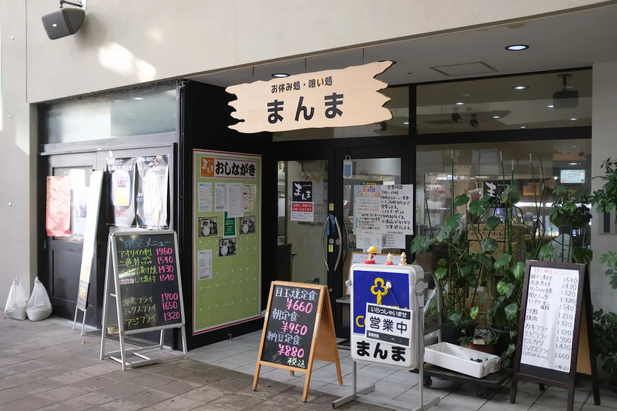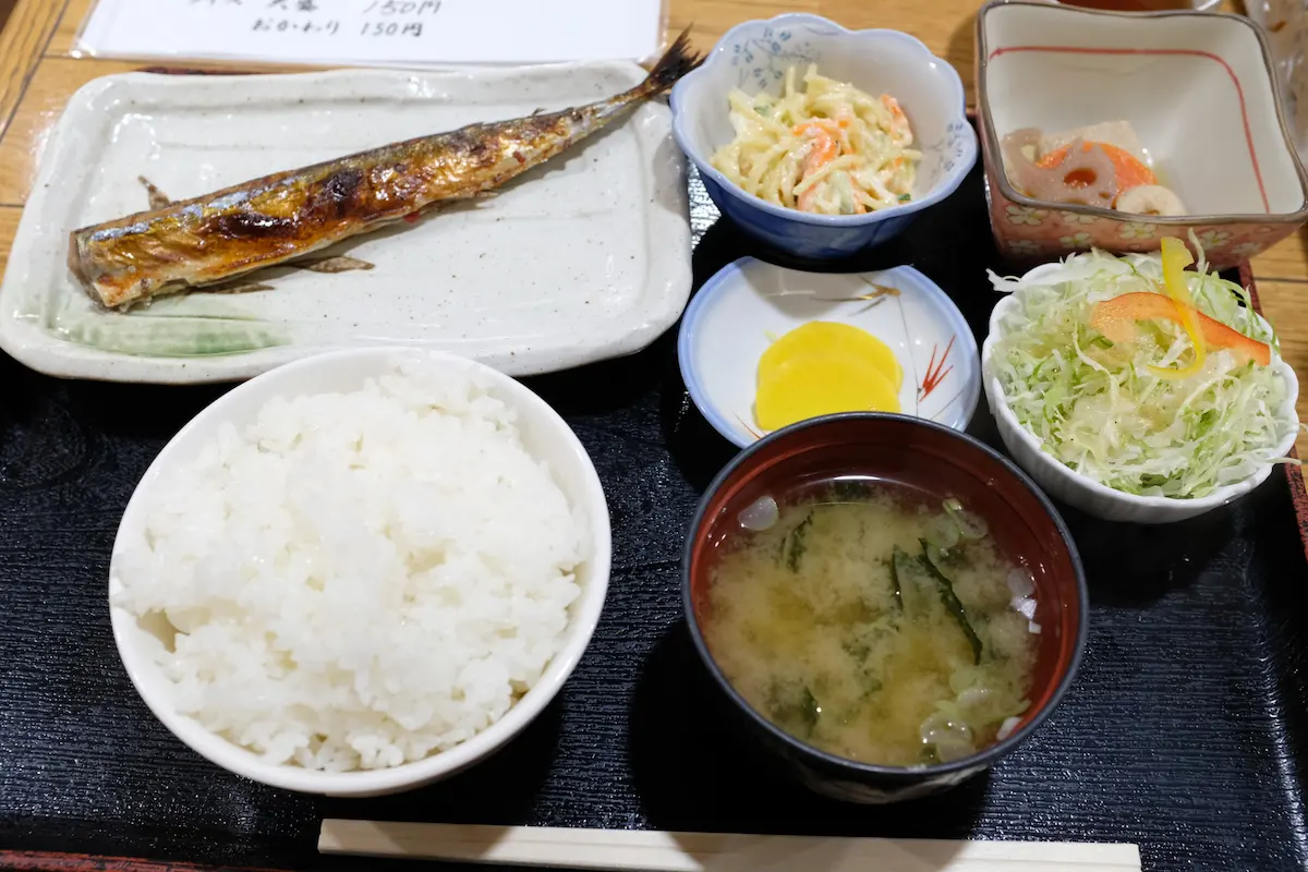 秋田駅近くの秋田市民市場内にある食堂「まんま」で朝食を頂きました 喫茶店のような雰囲気の店内で、2人掛けのテーブルに着席しました メニューを見ると朝定食が3種類あって、その中からピリ辛サンマが付いた朝定食B950円を注文しました 私のような観光客は魚介類を頼みがちですが、市場関係者も多いのでハムエッグや納豆のモーニングとかもあったりします 待つこと8分ほどで注文した朝定食が運ばれてきました この日の朝定食Bにはメインのピリ辛サンマの他、サラダ、サラスパ、煮物、ご飯、味噌汁、沢庵が付いていました ピリ辛サンマは頭が取ってあり、サンマ自体はどちらかというとスリムな感じがしました 中骨を取るために背中から分けてみたら、内臓も取ってあって食べやすいです 赤っぽく写っているのがピリ辛の唐辛子成分で、ピリ辛汁に浸けたサンマを焼いている感じでしょうか 食べてみると醤油無しでもしっかり味が付いていて、サンマ独特の旨味を含んだ脂分と辛み成分がマッチしています ピリ辛サンマなるものを初めて食べますが、こんな食べ方があるなら家でもやりたいと思うくらい気に入りました このサンマが硬めに炊いてしっかり米感が残るご飯とぴったりです 秋田は米どころだけあってご飯のレベルも違うのかと朝から感動してました 小鉢のサラスパを懐かしさを感じながら食べ、気付いたら漬物まで完食 他の朝定食は鮭やホッケがあり、昼のメニューも朝から食べられるので秋田市街で朝食を食べるにはいいお店だと思います