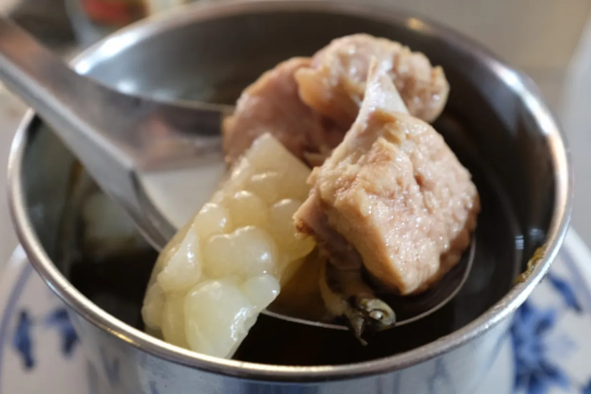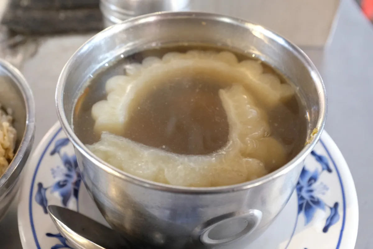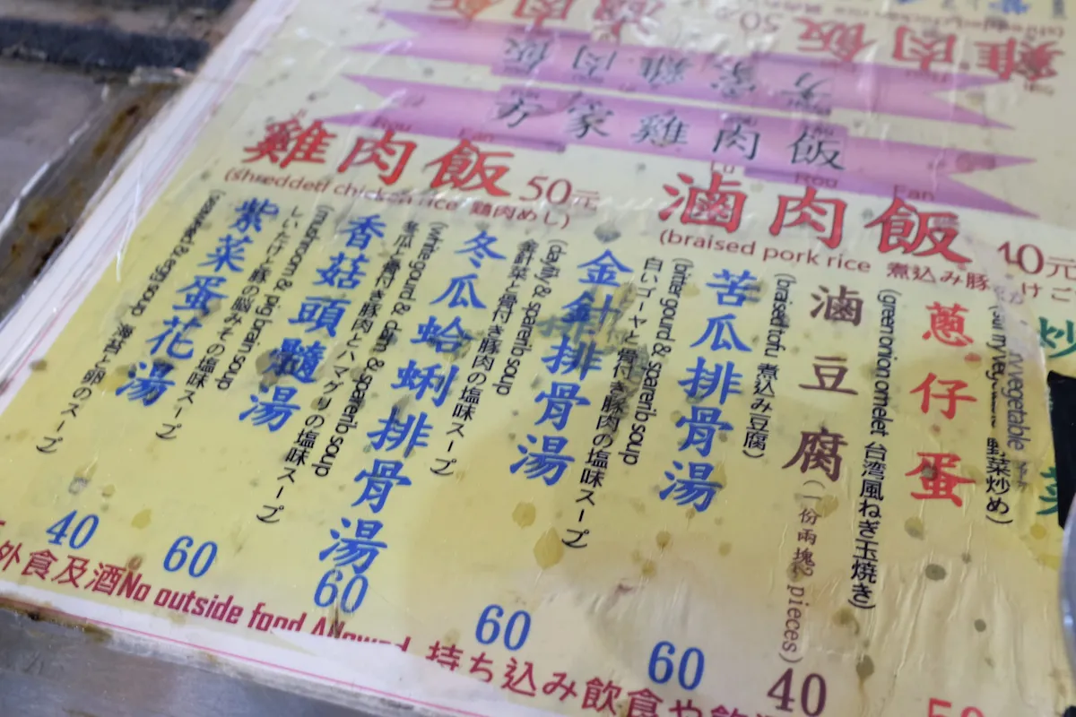 台北駅から北へ徒歩15分ほどの寧夏夜市を訪れ、「方家鶏肉飯」という屋台に入ってみました 店の人に人数を伝えると適当に座るところを指示してくれたので着席 テーブルにはメニューが貼り付けてあるので、言葉が分からなくても注文は簡単です 豚の脳みそというヤバそうなものもありましたがパス(笑) 今回は店の名前にもある鶏肉飯50TWDと苦瓜排骨湯60TWDを注文 注文すると直ぐに金属の器に入った鶏肉飯、1分後には苦瓜排骨湯も運ばれてきました 鶏肉飯は脂の少ない鶏のむね肉を繊維方向に裂いてご飯にかけた一品です 白い部分が鶏肉で、茶色く映っているのは飴色に炒めた玉ねぎです 鶏肉飯の味付けは濃くなく、あっさりしていて玉ねぎの甘みが際立って食べ易いです 続いて苦瓜排骨湯という白ゴーヤと骨付き豚肉の塩スープを頂きました 日本ではゴーヤと言えば緑ですが、台湾では白の方がメジャーだそうです 表面の粒々は白の方が大きく、食べてみると緑のものに比べると苦味は少なめに感じました スープの表面に浮いているのはゴーヤだけですが、底には豚肉の塊が沢山沈んでいます あっさりしたスープですが、豚をはじめとした素材の旨味がしっかり出ていました よくみると豚肉だけでなく、じゃこ(イワシの稚魚)の魚成分や豆鼓のような豆成分も入っていました 特別感は無いですが、500円くらいで軽く食事するには便利な店だと思います