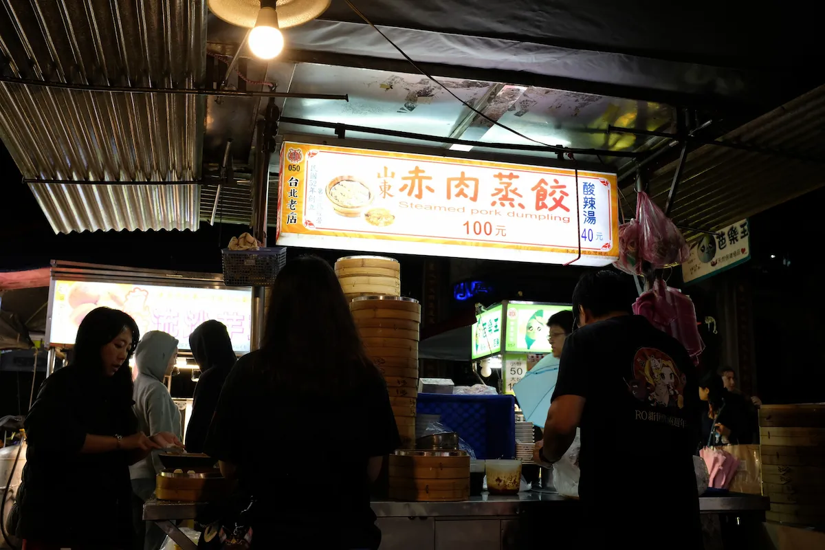 台北駅から北へ徒歩15分ほどの寧夏夜市にある屋台「山東赤肉蒸餃」に入ってみました この店のメニューは蒸餃(蒸し餃子)と酸辣湯のみです 着席すると店員さんが英語で「1 dumpling?」と聞いてくれたので個数を答えれば注文できました 蒸餃100TWDを注文すると一瞬で蒸籠が運ばれてきます 蒸籠の中には白い皮に包まれた蒸し餃子が10個きれいに並んでいます テーブルにある調味料で酢醤油を作って早速頂いてみました 分厚めの皮の中に豚ひき肉と野菜類が入っていて、コリコリした食感が印象的でした 竹の子かなと思いましたが、緑色なのでキャベツのようです 10個のうち3個くらいは肉汁の存在を感じましたが、基本的にはあっさりした感じです それでもしっかり具材の旨味は閉じ込められており、ごま油の香りがアクセントなっていて美味しかったです 調味料の中にラー油があり、油分と細かい唐辛子成分をタレに少し入れると辛味が増して個人的には好きでした 一つずつがそれなりの大きさあるので10個食べるとこれだけでそこそこお腹が満たされるボリュームです 500円くらいで手軽に点心が食べたい方にはオススメのお店です