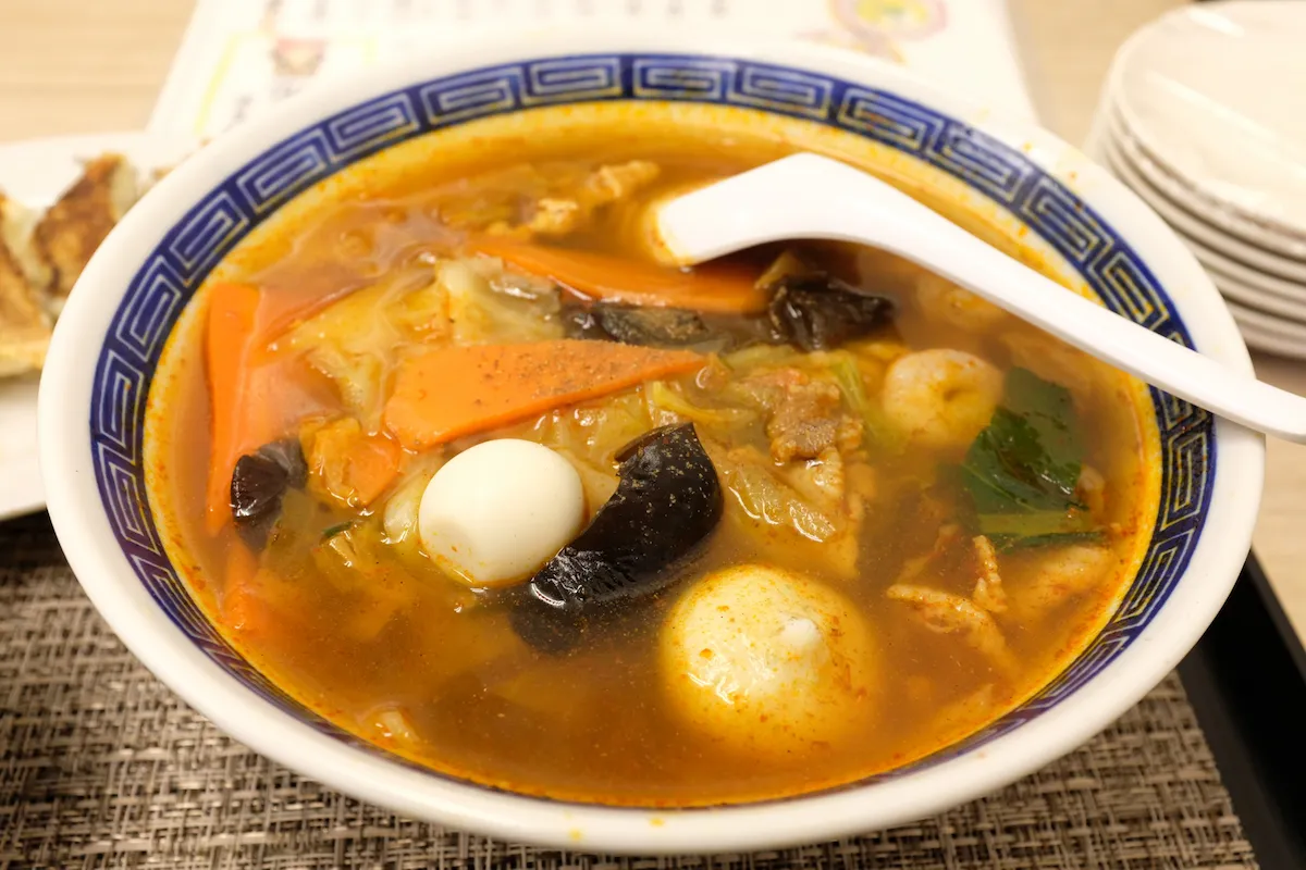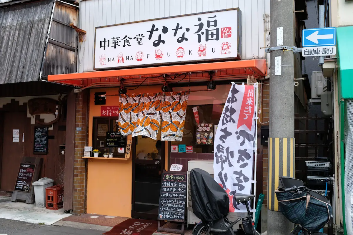 阪急伊丹線稲野駅西口から直ぐの中華食堂「なな福」でランチを頂きました 街の中華料理店といえば男性サラリーマンのイメージですが、外観を見ると女性も入り易そうな感じです テーブル席が3つとカウンター4席の小さな店で、カウンター席が狭かったので4人掛けのテーブルに相席で座らせてもらいました 色々メニューがある中で、壁に貼ってあったおすすめセット1200円というのが気になって早速注文 お客さんが一気にやってきた時間だったので、注文から20分強かかってセットが運ばれてきました おすすめセットには麻辣湯麺、焼餃子、ライス、ザーサイが付いています メインの麻辣湯麺は野菜を中心にたっぷりの具が入ったピリ辛麺です セットなので麺は控えめなのかと思いきや、器は想像の1.5倍はある大きさでした 赤い唐辛子成分が浮かんだ茶色のスープの中に、人参、キャベツ、キクラゲ、うずらの玉子、豚肉、小エビなどが麺を隠すように入っています 具の上から花椒のパウダー(?)らしきものもかかっており、麻と辣が揃っているようです スープを飲んでみると、具材から出る旨味と甘味に中華調味料の独特の風味が合わさってなかなか美味です その後から辛味がガツンとやってきて、竹バイクのカプサイシンセンサが常時反応 額から滝のような汗が止まらなくなります(笑) 続いて麺を引っ張り出してみました 麺は透明感がある中細の縮れ麺で、粘度の低いシャバシャバの麻辣湯にも適度に絡むタイプです 麺の上にあるドラクエのスライム型の物体はあまりお目にかからない代物です 水餃子の仲間かなと思って食べてみると魚のすり身で中にプチプチの魚卵が入っていました 調べてみると魚包蛋というもので台湾のおでんや鍋などに入っているらしいです 具だけでなく、麺も相当ボリュームがあるので、私でもこれだけでお腹いっぱいになるくらいでした でもこのセットには焼餃子とライスが付いているんです 餃子1人前6個入りでそこまで特別な点は無いですが、片側がパリパリで焼かれていて食感GOODです 肉と野菜の餡の中にニンニクもしっかり入っているタイプで、お腹一杯なのにご飯が進んじゃうんです 気付けば餃子もライスも完食しており、最後に茶色のザーサイを頂いてごちそうさま 町の中華屋さんですが、中国料理の調味料や食材も使っていて個人的には結構気に入りました