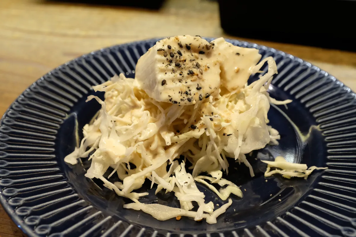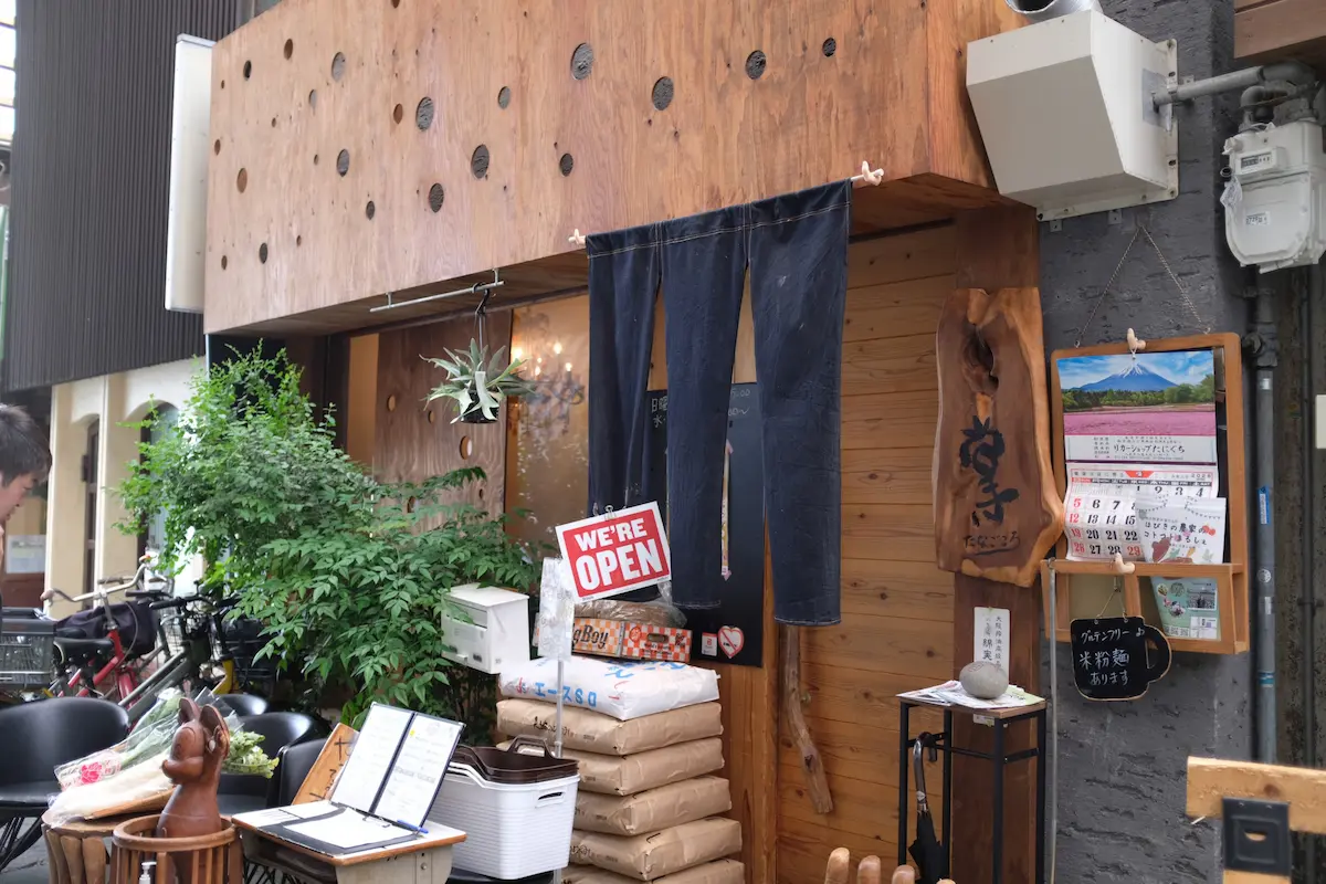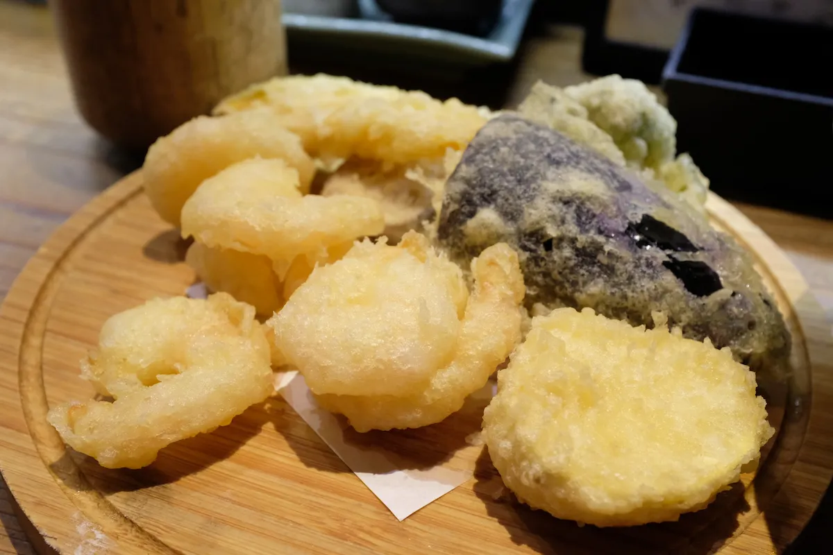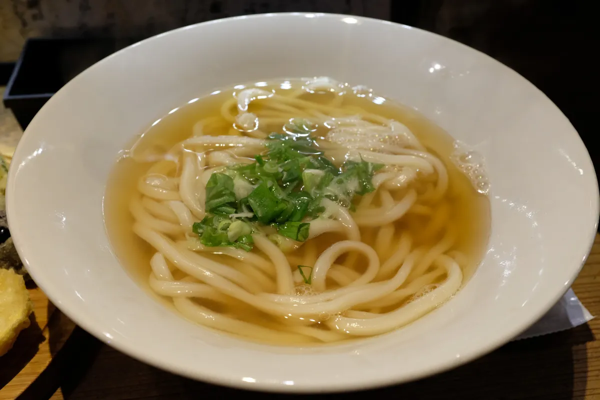 近鉄南大阪線藤井寺駅から南へ徒歩3分ほど、菊水商店街にあるうどん店「掌(たなごころ)」でランチを頂きました 11時の開店直後に訪れたので、私がこの日最初の客だったみたいです カウンター席に座って、メニューを見ると普通のうどんから変わり種まで色々あります 悩んだ挙句、人気No.1のシールが貼ってあるえびと野菜の天ぷらうどん1400円を注文しました うどんは2玉まで増量が無料なので、2玉(400g)にしてもらいました 注文を終えると、直ぐにサービスの豆腐サラダを出して頂けます キャベツの千切りの上に豆腐を載せて、ゴマドレッシングをかけた一品です 豆腐はしっかり豆の味がして、ドレッシングのゴマの風味がちょうど良いです 豆腐は藤井寺の細川食品、キャベツも提携する農家から仕入れているようで地物へのこだわりがあるようです サラダをペロリと食べ終えましたが、まだうどんは来ないのでここで工作の時間です この店のオリジナル箸袋を折ると前方後円墳が完成 こういうところにも地元愛が隠されているんですね 箸置きを作って数分でえびと野菜の天ぷらうどんが運ばれてきました うどんと天ぷらは分けて提供されるので、この写真はかけうどんです 早速、レンゲで出汁を掬って飲んでみると、口の中で旨味の花が一気に開きます 基本的にはカツオ、昆布、イリコから取った奇を衒わない出汁なのに物凄く美味しいです うどん自体は標準より僅かに細めの印象で箸で持ち上げると透明感があります 表面はツルツルで啜ると簡単に口の中に飛び込んできます 細目で温かいうどんなのに、しっかりコシもあってかけうどんとしてレベルが高いです 別皿に盛られた天ぷらはえび、サツマイモ、蓮根、茄子、ブロッコリー、かぼちゃと種類が豊富です えびの天ぷらは小エビの天ぷらをひと回り大きくしたくらいのサイズで、外はサクサク、中はプリプリです 野菜の天ぷらの中では大きな茄子が印象的で、水分豊富なのにべたべたにならず、野菜本来の味がしっかりしました 注文時はうどん400gを食べられるか心配になりましたが、美味しくてあっという間に完食してしまいました 夏から秋にかけて出るイチジクのうどんなど今度は変わり種も食べてみたいなぁ... ただ藤井寺にはなかなか行く機会が無いので、近所にこういううどん屋が欲しいと心の底から思うのでありました