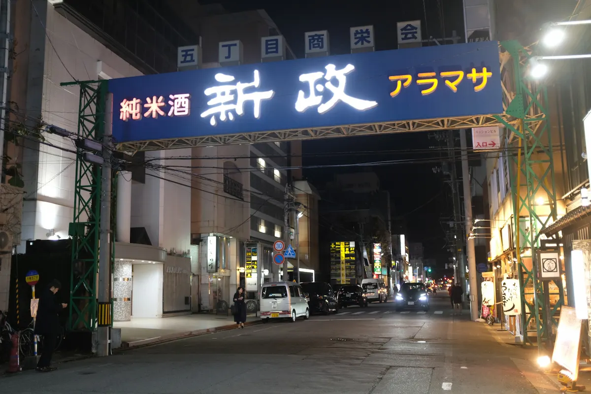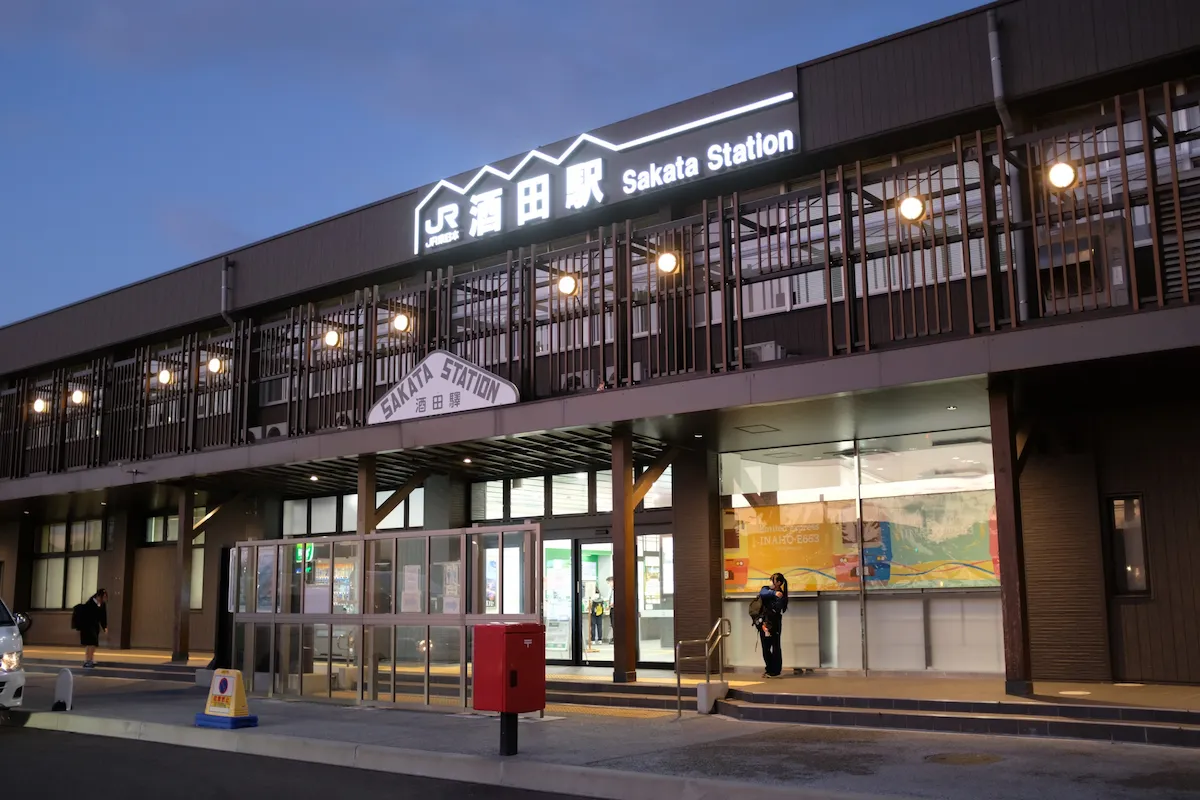 鶴岡から酒田まで庄内平野を電車で30分。 16:50頃、太陽が海に沈んだ頃に酒田駅に到着。 鶴岡と酒田は庄内平野にある同規模の街で日本における代表的な双子都市です。 藩庁があった鶴岡が行政や教育の中心であるのに対して、北前船の寄港地だった酒田は商業、貿易の中心地です。 駅前には「MIRAINI」という文化施設があり、1Fに図書館が入っていて勉強している人が多数いました。 暗い道を15分ほど歩いて、中心市街地にあるこの日のお宿「最上屋旅館」に辿り着きました。 なんとこの宿は100年を経過すると老舗で、日本ボロ宿紀行という本にも紹介されています。 おじさんが出てきて、とりあえず風呂とトイレの場所を教えられ部屋に案内されました。 旅館としては至って普通で、隣の部屋とも離れていたのでプライベートも確保されていました。 トイレや風呂は共同でも、竹バイクはこういう普通の家のような旅館の方が気が休まって好きです。 しばらく部屋で休憩してから晩飯を食べに外出。 朝食に海鮮丼&汁2杯、昼食に大盛ラーメン&飯を食べ、まだ消化しきっていないので、この日は近所の飲み屋に行ってみることに。 「久村の酒場」という日本居酒屋遺産に記されている店です。 詳細 入口からローカルな雰囲気がありますが、カウンター席に座って庄内限定の日本酒を絶品のアテと一緒に頂きました。 店員さんや近くに座った方と話しながら呑めて楽しかったです。 グラス3杯の日本酒でほろ酔い気分でちょっとだけ辺りを散策。 酒田中心部の中町あたりは鶴岡よりはちょっとだけ多く飲み屋がありますが、人通りはほとんどなく寂しかったです。 鶴岡も酒田も美味しい酒はあるけどみんな外で呑まないのかもしれません。 宿に戻って風呂に行ってみると、清潔な風呂場に適度なサイズの浴槽があり、足が伸ばせて気持ちよかったです。 こうしてこの日のタスクは全て終了し、PC作業をしてから眠りにつきました。 日付が変わって11/5(水)、朝2時半に突然目が覚めました。 酒で眠りが浅くなっていたせいか、色々翌日の計画が頭を巡って全然寝れなくなりました。 しばらくすると段々寒くなってきて、またこれが入眠を邪魔します。 保温性という観点からは築100年はイマイチですね。(笑) かと言ってエアコンをつけると乾燥してしんどいし...。 結局、エアコンをつけてマスクをして寝たのですが、どうも寝たのか寝てないの分からない状態で朝日が昇りました。 すっきりしない眠い目をこすり、朝8時前に外出して朝食へ。 5分ほど歩いたところにある酒田ラーメン照月でワンタンメンを頂きました。 詳細 鶴岡と同じ魚介ベースの清湯タイプですが、酒田のラーメンの方が素直な味で私は好きです。 この店の前に酒田市役所とホールがあり、なかなか金をかけた感じが出ていました。 宿に戻るといつの間にか布団が畳まれており、部屋を散らかして出ていかなくてよかったと思った次第です。 ここで頭を悩ませたのが再び電車の時刻問題。 時刻は8:30過ぎで、次の秋田方面の在来線は9:44発、その後は12:29...。 由利本荘に行くとしたら9:44がベターですが、由利本荘をスキップして秋田へ行けば12:29でも可。 悩んだ挙句、酒田の街をまだ堪能していないので後者に決定しました。 宿の支払いを終えて酒田観光開始です。 宿から東へ歩いていると山王くらぶなる古そうな建物を発見。 元々料亭で、今は国登録有形文化財だそうです。 そこから南に何か湯気が出ている建物があり、近付くと米を炊く香りがします。 前まで行ってみると上喜元で有名な酒田酒造でした。 昨日訪れた飲み屋のおばちゃん曰く、「地元民はその年の上喜元で酒の良し悪しを判断する」そうです。 ボジョレー・ヌーヴォー的立ち位置ですね。(笑) 西へ向かって少し坂を上がると日和山公園に到着。 下日枝神社の立派な随神門が目の前に現れました。 神社を参拝してから日和山公園にある展望台からは酒田港を一望出来ました。 よく見ると鉄道の引き込み線があり、貨物列車専用の酒田港駅があります。 酒田は昔から北前船西回り航路の寄港地として繫栄した街なので、港が重要地点でした。 そのため日和山公園には常夜灯や白亜の灯台が残っています。 また公園の中の池には北前船の帆船を模した千石船が浮かんでいたりします。 日和山公園から芭蕉が歩いたという芭蕉坂を抜けてまっすぐ歩き、港に向かうと市場などがありました。 生憎、水曜日はみなと市場も酒田海洋センターも定休日で賑わいはイマイチでした。 漁協の横を通って、海沿いを歩いていると、新井田川河口にイカ釣り漁船を発見。 酒田はイカの街としても有名で、イカ釣り漁船は一度港を離れると1ヶ月半の漁に出るそうです。 川を少し上った先に木製の山居橋がかかっており、これを渡ると観光名所の山居倉庫に至ります。 この倉庫は米の積出のための倉庫で、最上川舟運で運ばれる米の預かり貯蔵する場でした。 有名なのは、この建物の裏側の景色です。 黄色
