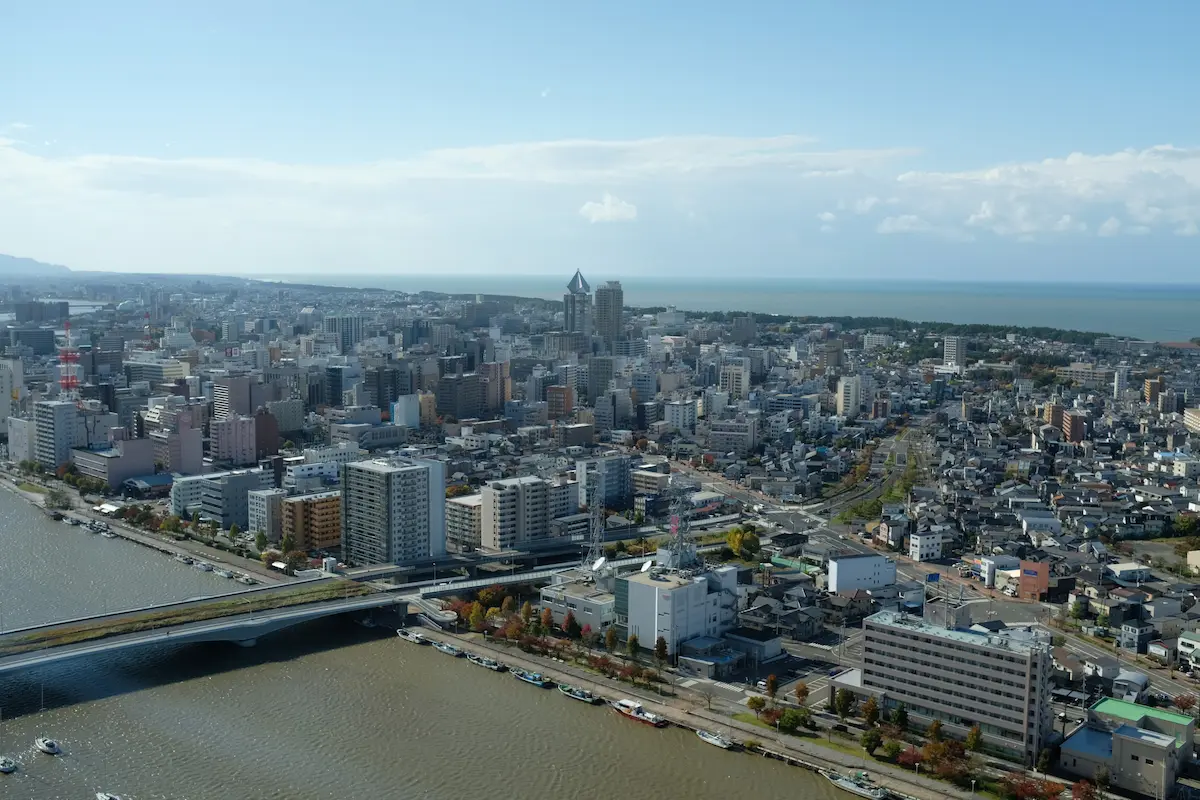 40歳になる年に取れる4日間の特別休暇を利用して、4泊5日の一人旅に出掛けました。 念のため言っておきますが、まだ39歳です!(30代と言いたい) 今回は新潟から日本海側を北上し秋田へ至る旅で、羽越旅行と名付けます。 11/2(日)、ANA1657は伊丹空港を10:10頃離陸し、僅か45分ほどのフライトで11時頃に新潟空港へ着陸。 新潟駅行のバス乗り場の時刻表を見ると次のバスは11:25。 バス停にいても暇なので空港の屋上展望台に行ってみました。 乗ってきたANA便とフジドリームエアラインが1機ずつ停まっていているだけで伊丹空港とは混雑度が全く違います。 新潟空港は海に面しており、向こうに見えるのはくすんだ青をした日本海。 しばらく時間を潰してからバス乗り場に戻ると長蛇の列。 結果、バスには乗れたものの座れず、20分くらいバスに揺られて新潟駅に到着。 日本海側唯一の政令指定都市だけあって駅前には多くの人が行き交います。 ここから駅に入るのかと思いきや、踵を返して万代島方面へ。 北へ歩くこと20分ほどでピアBandaiに着きました。 このピアBandaiは魚、肉、野菜などを売るマーケットで、休日の正午は非常に賑わっていました。 賑わっているのは良いですが、目星を付けていた海鮮丼の店も激混み。 仕方ないので、ピアBandaiの隣にある新潟県水産会館へ。 ここの2Fにある地魚食堂 瓢に入って、タタキ丼を頂きました。 詳細 セルフサービス形式で席は沢山あり、こちらの方が落ち着いて食べられたので結果オーライです。 昼食を終えて建物の背後にある朱鷺メッセへ。 写真では目の前にありますが、海の上は歩けないので大きく回り道を強いられます。 12年前に新潟市を訪れた際にも立ち寄りましたが、高さ約140mの建物の31F展望台が無料で開放されています。 「〇〇と煙は高いところが好き」なので竹バイクは行きたい気持ちを抑えられなかったわけです。 この写真は朱鷺メッセから西側の繁華街古町方面の眺望です。 新潟の繁華街は新潟島と呼ばれる信濃川の左岸にあり、新潟駅からは離れた場所に立地しているのが特徴です。 新潟駅は朱鷺メッセから見て南にあり、こちらも背の高いビルが立ち並び、十分都会だと思います。 この朱鷺メッセやピアBandaiがいるエリアは万代島という地名からも分かるように昔は川の中州だったようです。 今昔地図で見ると確かにそうなっています。 リンク このエリアを堪能して再び新潟駅方面へ。 駅前から続く東大通はイチョウ並木が美しく、秋を感じながらウォーキング。 駅に着いたのが13:20頃で次の電車は25分後。 調べると隣接する商業施設に「利き酒番所」という100種類以上の日本酒が呑める場所があるというので行ってみました。 コインを購入して、必要枚数だけ機械に入れると酒が味わえるということで期待に胸を膨らませて到着。 ...したものの並び過ぎ&時間が無くて諦めました。(涙) こういうのが電車の本数が少ないエリアでの電車旅のデメリットですね。 「俺はそこまで酒が好きじゃない」と己を偽って心を落ち着けてから13:45発の電車に乗り込みました。 |
