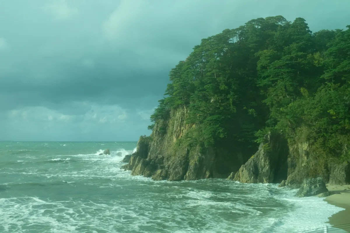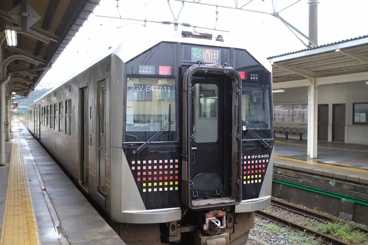 新発田駅から30分強、10:51に村上駅に到着。 新発田が雨だったのが嘘のように村上駅前は晴天。 まずは駅前にある石田屋で腹ごしらえ。 村上と言えば鮭なので鮭尽くしのみおもて定食を頂きました。 詳細 イクラが乗ったハラコ飯と鮭の酒浸しがヒットでした。 村上と言えば塩引鮭が有名ですが、塩引鮭と新巻鮭の違いはよく分かりませんでした。 30分ほどで食事を終えて、村上観光を開始。 村上市の観光名所は村上駅から東へ1.5kmほど離れたところに集中しています。 村上藩の城下町だけあって昔ながらの家々が残る街を写真を撮りながら歩いていました。 しかし、寺町に差し掛かったあたりで雨が降り始めました。 あんなに晴れていたのにお天道様はどうも竹バイクが嫌いなようです。 芭蕉と曽良が立ち寄ったと言われる浄念寺でしばらく雨宿りをしてましたが、なかなか雨は止みません。 仕方なく傘を差しながら散策再開。 安善小路と呼ばれる黒塀の路地は逆に雨の方が映えるかもしれません。 安善小路を抜けると村上町屋通りに至り、この南北に走る通りが村上城下町のメイン観光地です。 ただこの通りの観光は後回しにして、もうひとつ東側の通りへ。 ここには村上歴史文化館や若林家住宅がありました。 ただ茅葺の若林家住宅は改築中(?)らしく、歴史文化館もあまり惹かれなかったのでスルー。 さらに北東へ歩いてまいづる公園まで行ってみました。 ここにも旧藤井家住宅、旧岩間家住宅など茅葺の住宅が保存されています。 結局、これまた惹かれなかったので村上町屋通りに戻りました。 雨ですが、メインの観光地だけあってそこそこ人通りがあります。 この日は旗日(祝日)だったので古い街並みに日の丸がきれいに並んでいました。 写真を撮りたいのですが、雨がどんどん強くなって雨宿りしながら少しずつしか移動できません。 雨宿りついでに千年鮭きっかわという店に入ってみると、奥に鮭がいっぱい吊るしてありますよと店員さんに教えて頂きました。 店の奥の引き戸を開けると、大量の鮭が干してある空間があり、圧巻でした。 これが村上の冬の風物詩である塩引鮭。 雨じゃなかったら入らなかったので、これはラッキーです。 こうして辺りを散策していると電車の時間が近づいてきました。 本当は鮭の博物館であるイヨボヤ会館にも行きたかったですが諦めました。 なぜなら13:41の電車を逃すと次が16:37なので、何としてもこの電車に乗らなければなりません。 駅まで20分くらいかかるので雨の中ちょっと早歩きで向かいました。 ちょっと急いでいたのは切符を購入する必要があるからです。 実は村上駅から北は交通系ICカード使用不可エリアなんです。 久しぶりに切符を改札に入れて、酒田行のワンマン電車に乗り込みました。 向かいのホームに特急いなほが止まっているなぁと思いながら、車内に入ったらアナウンスが流れました。 現在、村上駅から先は運転を見合わせております。 木の枝が電線に引っかかって除去作業が必要になったらしいです。 マジか...と思いながらも、車内に座ってPC作業をしていたら14:15になってようやく運転再開。 村上からトンネルを抜けると、電車は日本海の直ぐ傍を走り北へ向かいます。 笹川流れなど日本海の激しい波が作り出した雄大な景色を見ながら電車に揺られ、気付けば山形県に入りました。 |
